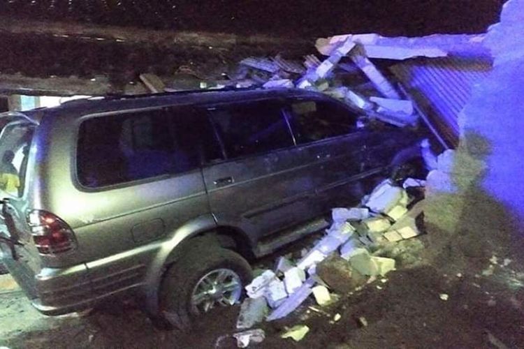 Pantauan di lokasi, bangunan depan rumah remuk lantaran tertabrak mobil.