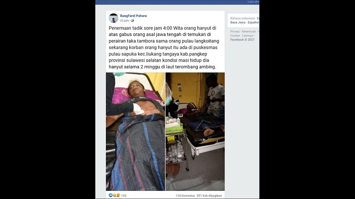 Kabar penemuan orang hanyut ini beradar di media sosial Facebook, Rabu (24/3/2021).