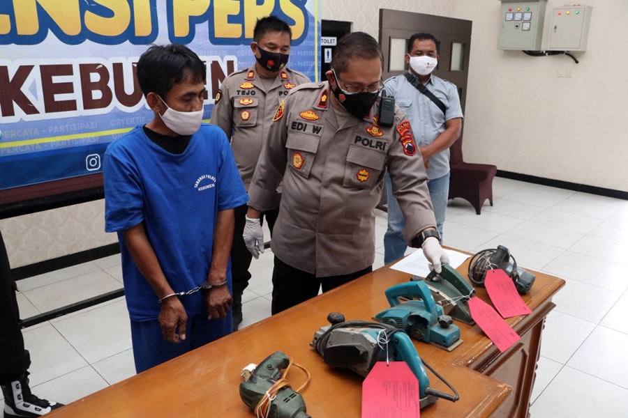 Tersangka, diduga mencuri di bengkel kayu milik korban SY (50) warga Desa Tunggalroso, Kecamatan Prembun, Kabupaten Kebumen pada Rabu (24/2/2021) sekira pukul 03.00.