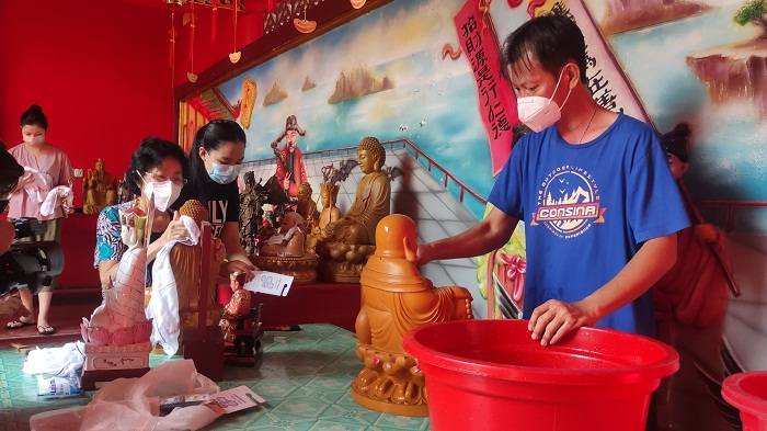 Mereka membersihkan peralatan ibadah dan memandikan kimsin (rupang), patung dewa-dewi yang tersimpan di dalam klenteng.