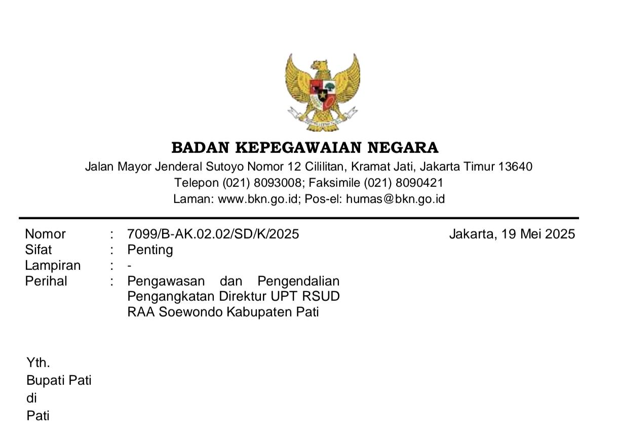 Surat bernomor 7099/B-AK.02.02/SD/K/2025 tersebut mencantumkan perihal pengawasan dan pengendalian pengangkatan Direktur UPT RSUD RAA Soewondo Kabupaten Pati.
