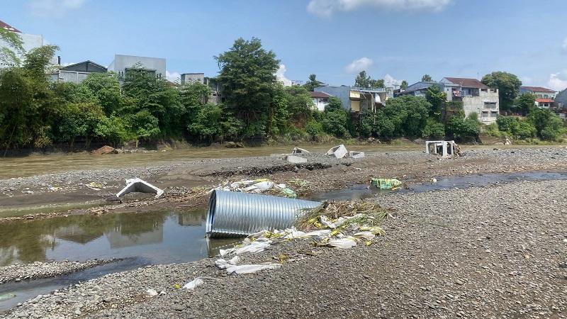 LOKASI KEJADIAN — Sejumlah alat proyek penguatan tebing Sungai Klawing berserakan di Sungai Klawing setelah diterjang banjir bandang, Senin (4/8/2025). Banjir bandang Sungai Klawing yang terjadi Minggu (3/8/2025) malam mengakibatkan tiga orang hilang.