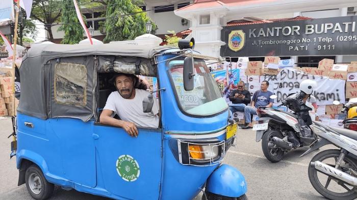 TRIBUNBANYUMAS.COM, PATI – Mengendarai bajaj yang selama ini menjadi mata pencaharian selama merantau di Jakarta, Paijan (65) rela menempuh perjalanan 12 jam demi mendukung demo Pati.