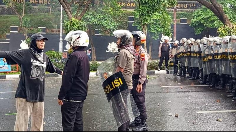 Demo terkait tewasnya Affan Kurniawan memanas di Polda Jateng. Lemparan botol air mineral pendemo dibalas tembakan gas air mata dan water canon.