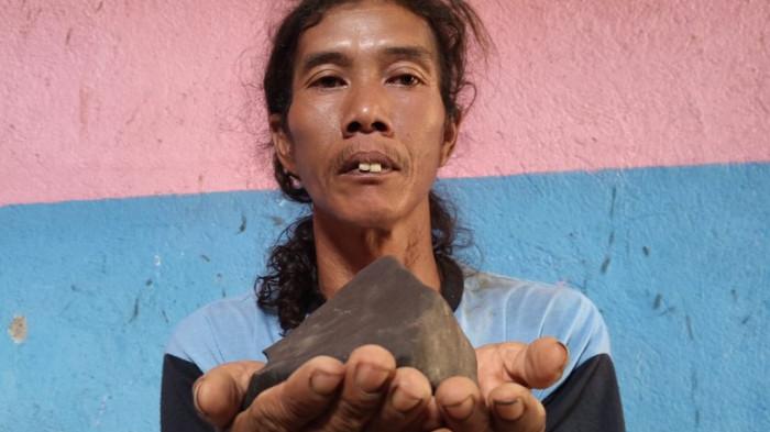 DIDUGA PECAHAN METEOR - Wasroni, warga RT 02 RW 02 Desa Jatilaba, Kecamatan Margasari, Kabupaten Tegal, Jawa Tengah, menunjukkan pecahan batu diduga meteor yang jatuh di pekarangan sebelah rumahnya pada Minggu (5/10/2025).